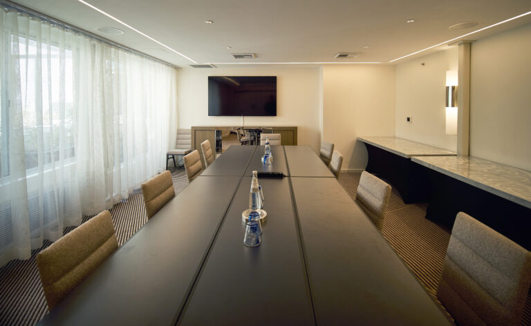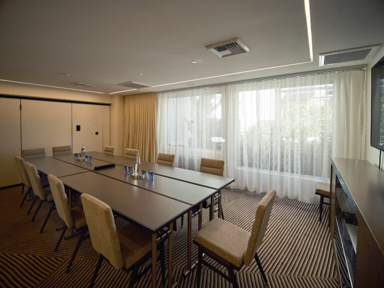 Bright meeting space with conference table and sheer floor-to-ceiling curtains.