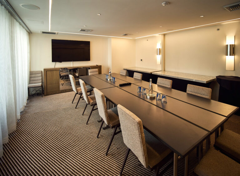 Conference room with U-shaped tables and presentation screen