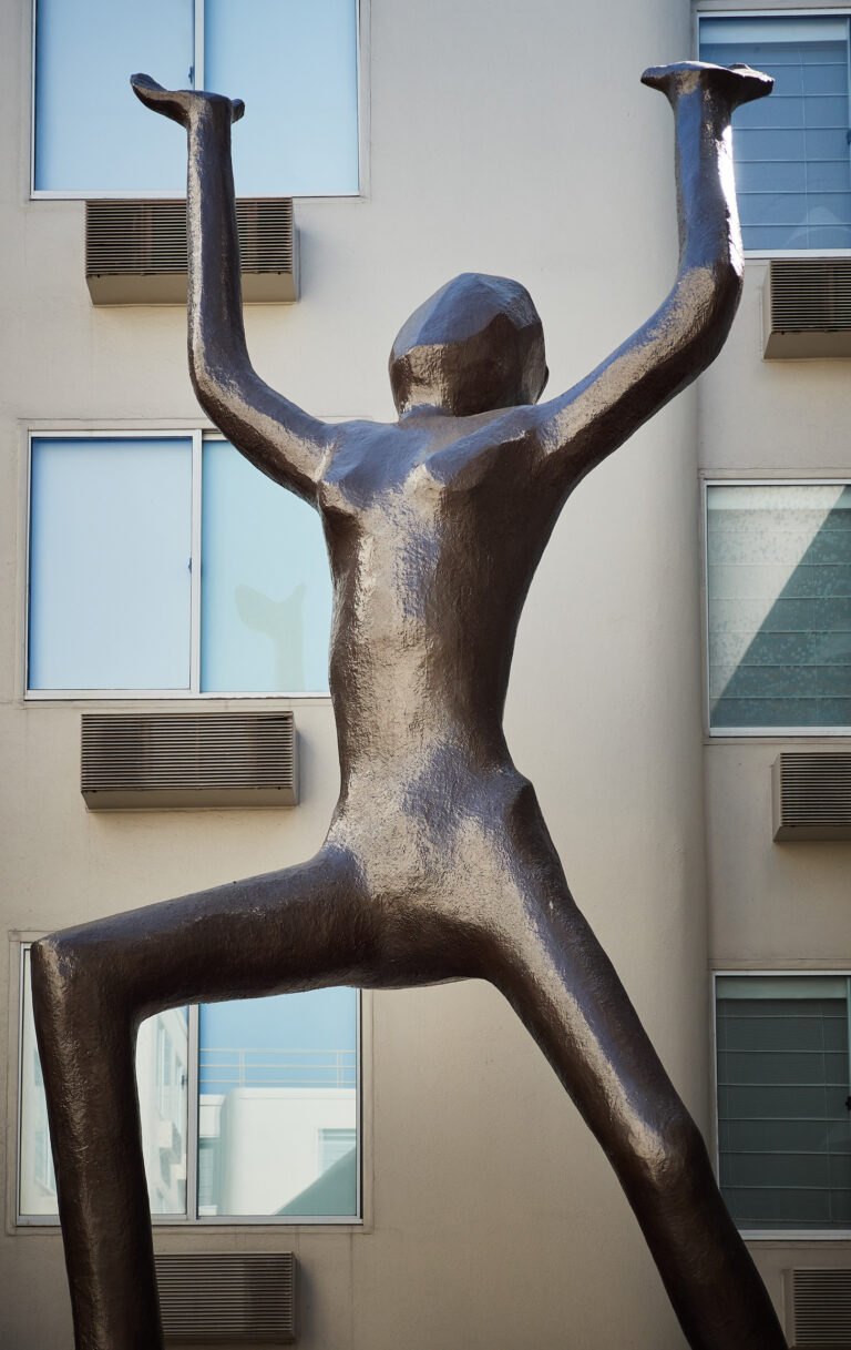 Tall abstract bronze statue in hotel courtyard