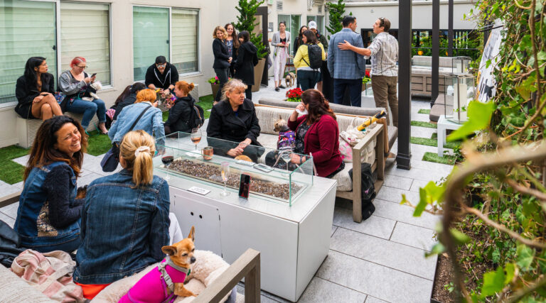 Guests socializing with pets in outdoor courtyard