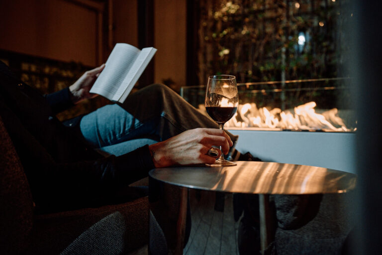 Evening diners enjoying wine at a restaurant table.