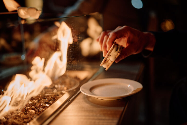 Freshly toasted s’more ready to enjoy by the fire.