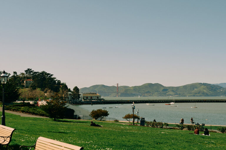 Waterfront park with Golden Gate Bridge and hills in distance.