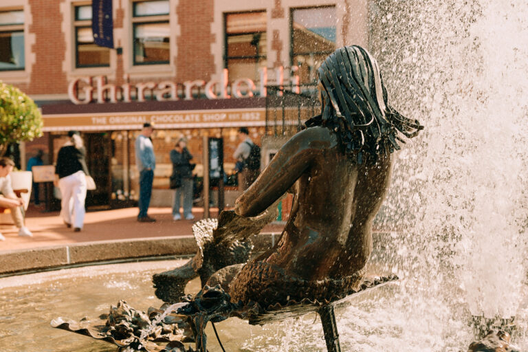 Ghirardelli Square fountain splashing with mermaid sculptures.
