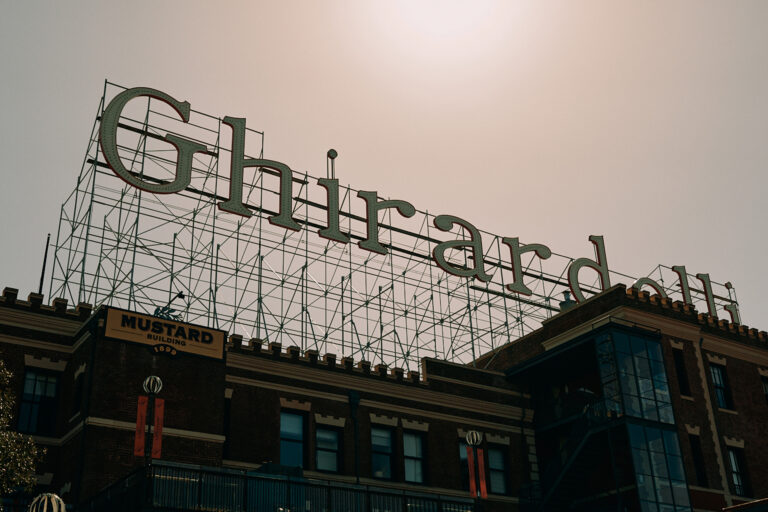 Ghirardelli sign atop historic brick Mustard Building.