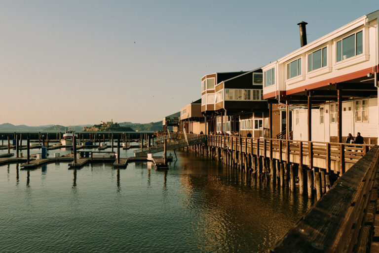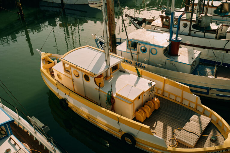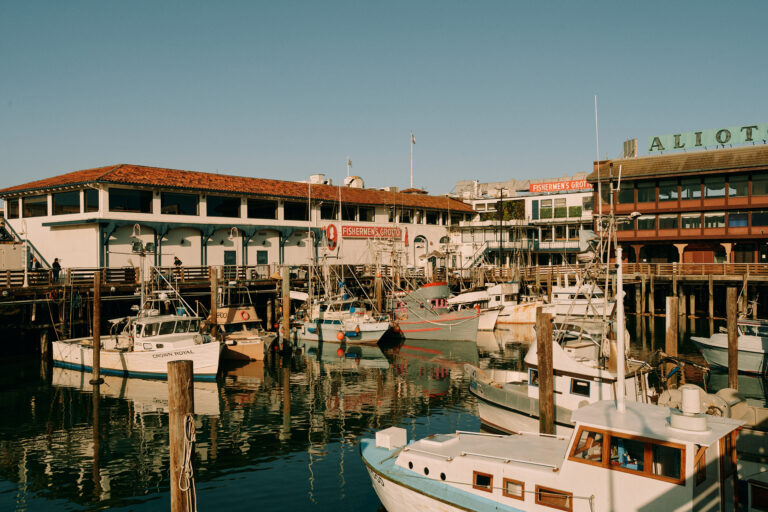 Boats docked in Fisherman’s Wharf marina on sunny day.