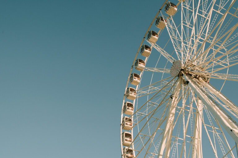 Skystar Ferris wheel towering upward against clear blue sky.