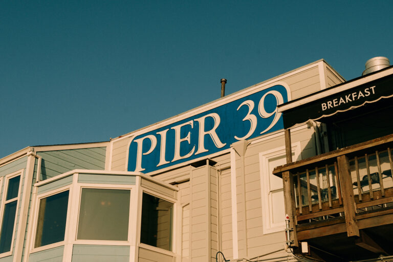 Pier 39 sign on waterfront building.
