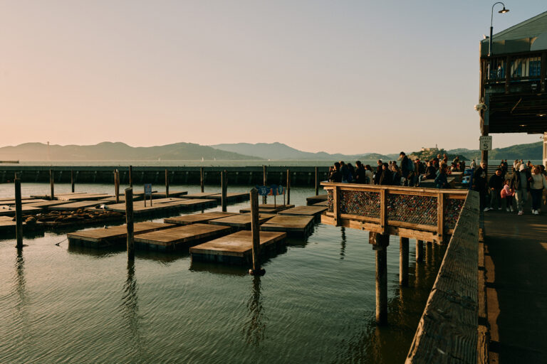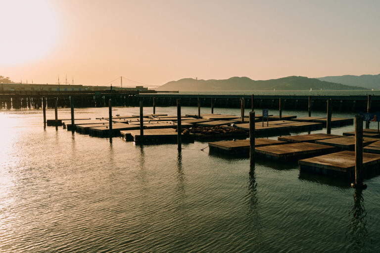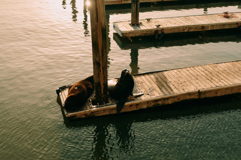 Sea lions on docks at sunset near Pier 39.