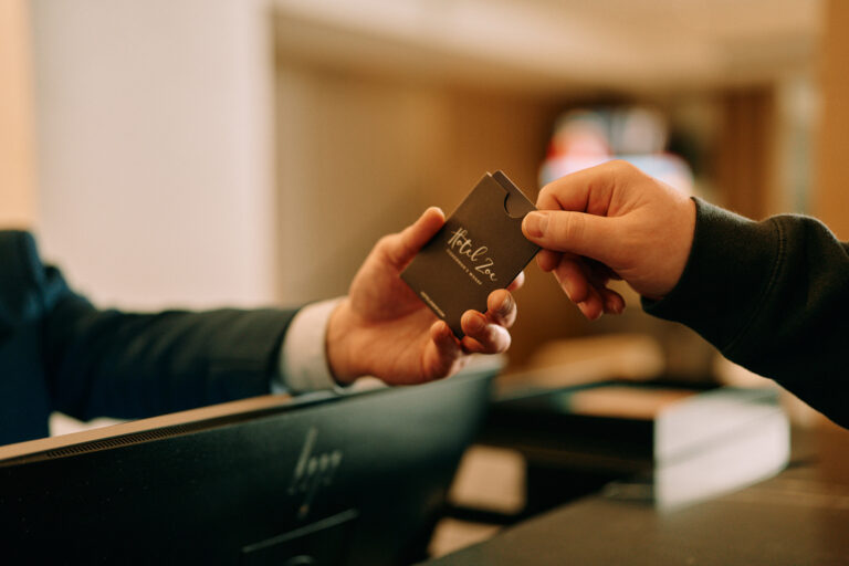 Hands exchanging a Hotel Zoe room key card.