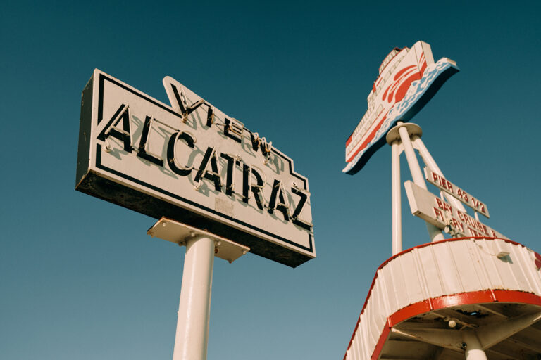 Vintage “View Alcatraz” sign against clear blue sky.