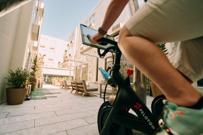 Guest riding Peloton bike in sunny outdoor courtyard.