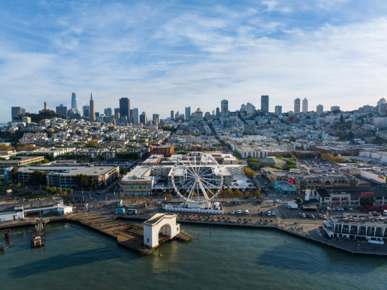 Aerial view of San Francisco skyline and waterfront attractions.